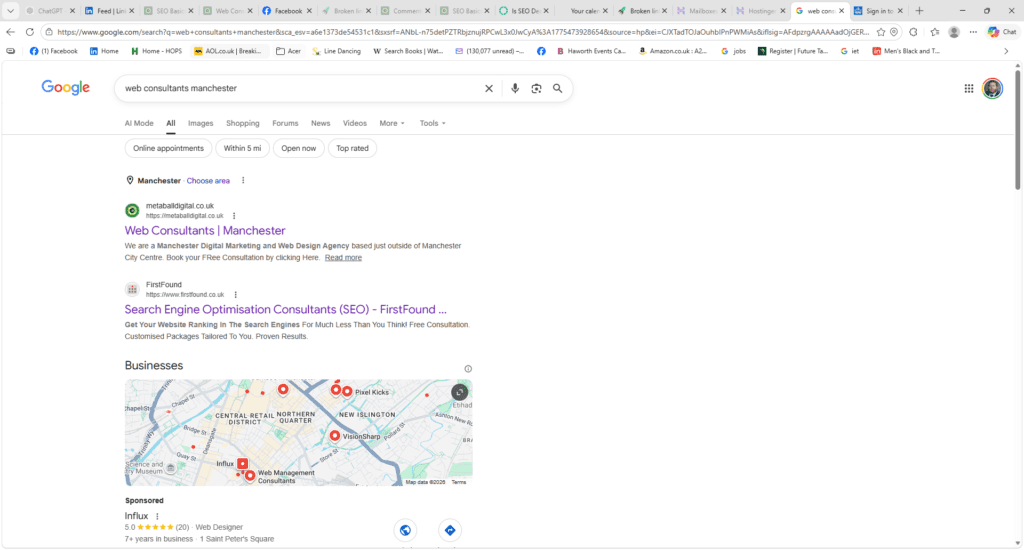 As you can see in the above image, we rank number one for web consultants in Manchester. This is due to being one of the most trusted for this service and shows we can optimise and provide useful content.
